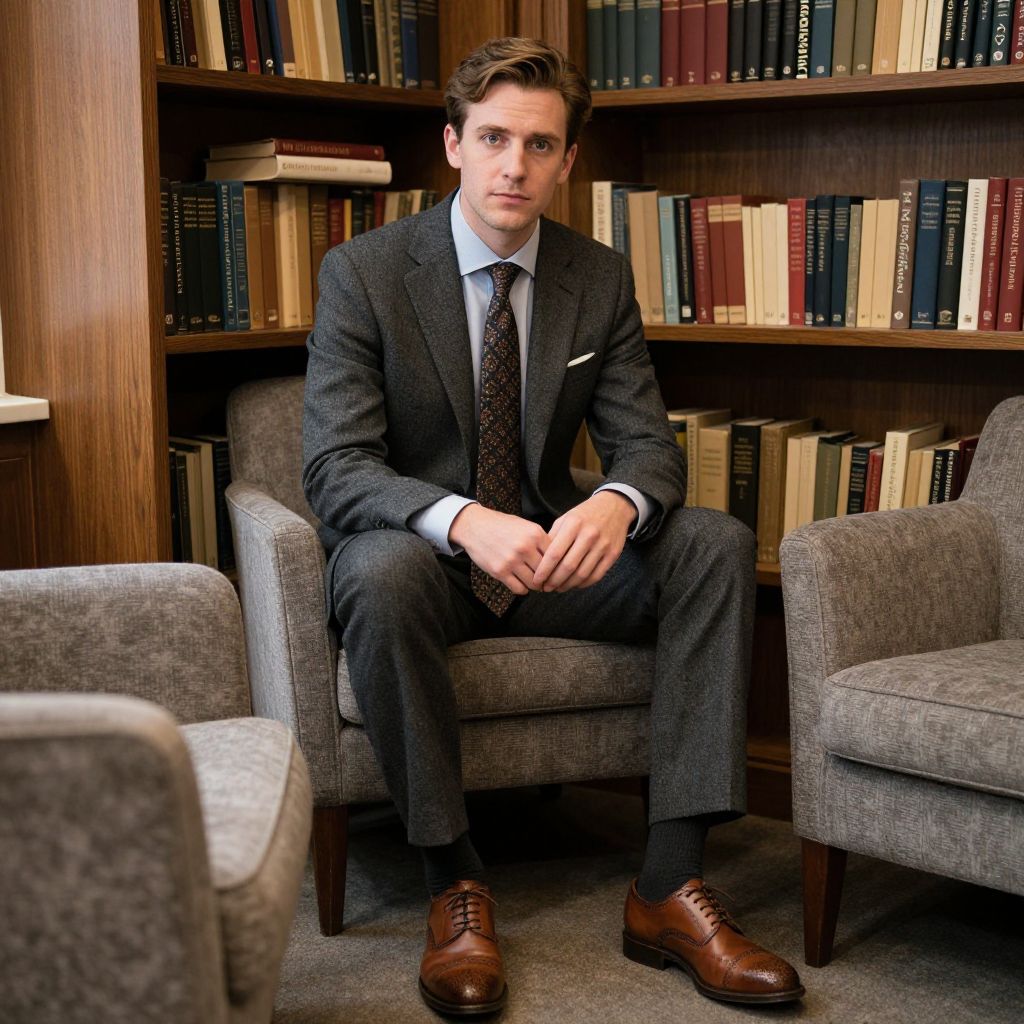 "a man, charcoal gray suit, textured fabric, light blue dress shirt, patterned silk tie, brown leather brogues, cozy library nook, shelves filled with human rights literature, soft armchairs, thoughtful expression, cameraphone style. Man has masculine face and piercing eyes"