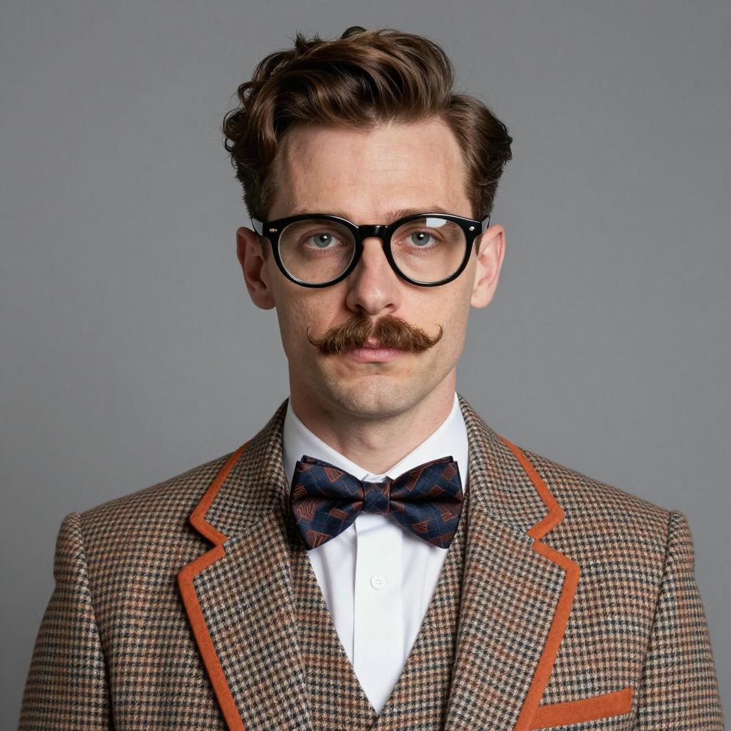 Man with a thick mustache, wearing a tall blue top hat and a worn, brown jacket, stands center. Several other men with tall hats, some blue, some red, in background. Overcast sky, urban setting. Crowd, serious expressions.