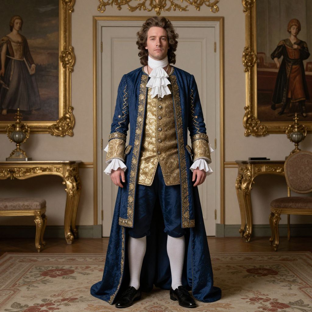 Photograph of a Caucasian man with shoulder-length curly brown hair, standing in an opulent room. He wears an 18th-century-style navy blue velvet coat with gold embroidery, white lace cuffs, and a white ruffled shirt. His white stockings and black shoes complete the outfit. The room features ornate gold-framed paintings of women in period attire, a white door, and gold-trimmed furniture. The floor is covered with a patterned rug, and the overall setting exudes a baroque elegance. The man's expression is neutral, and he stands with his hands by his sides.