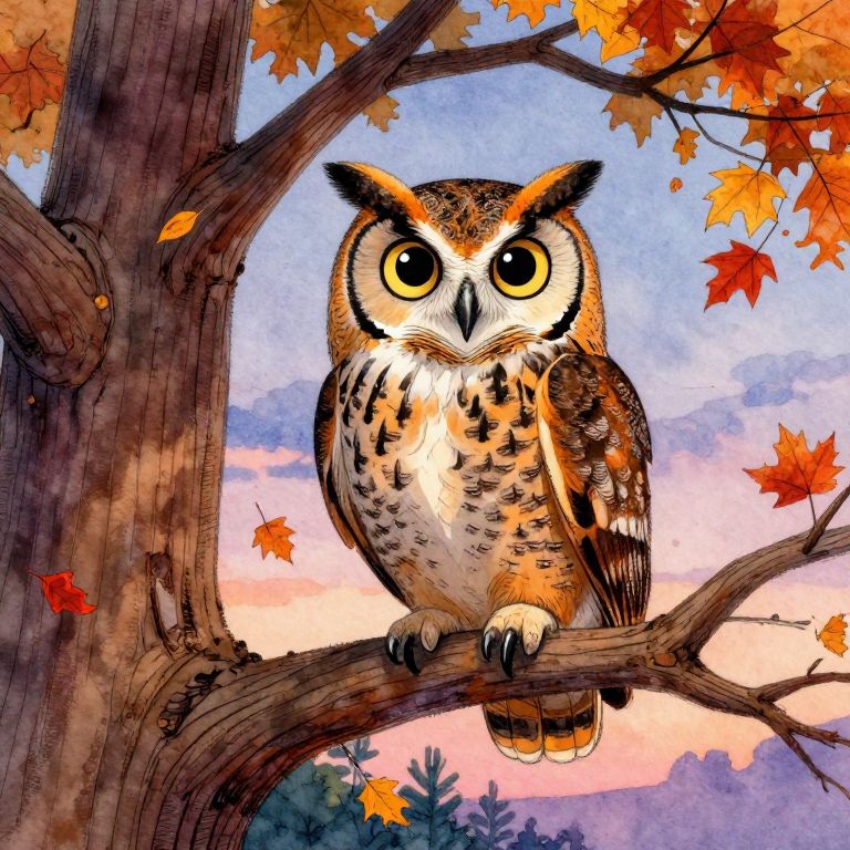 Owl drawing pictures featuring a whimsical great horned owl with large expressive eyes, illustrated in a vibrant watercolor style, perched on an ancient oak tree branch with autumn leaves swirling around and a twilight sky in the background.