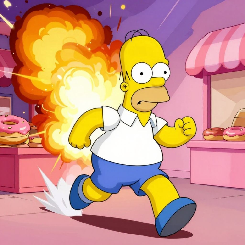 Homer Simpson running away from a donut shop explosion, dramatic cartoon style, vibrant color palette, intense action, humorous expression, animated background