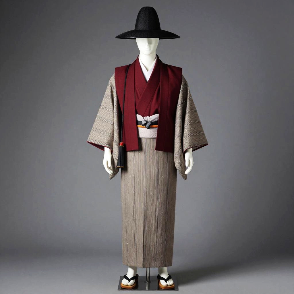Photograph of a mannequin dressed in traditional Japanese attire. The mannequin wears a wide-brimmed black hat, a deep red vest over a white shirt, and a long, beige kimono with black stripes. It also has black sandals and a small, rectangular bag slung over the shoulder. The background is a simple gray gradient, highlighting the mannequin's outfit. The overall style is elegant and historical.