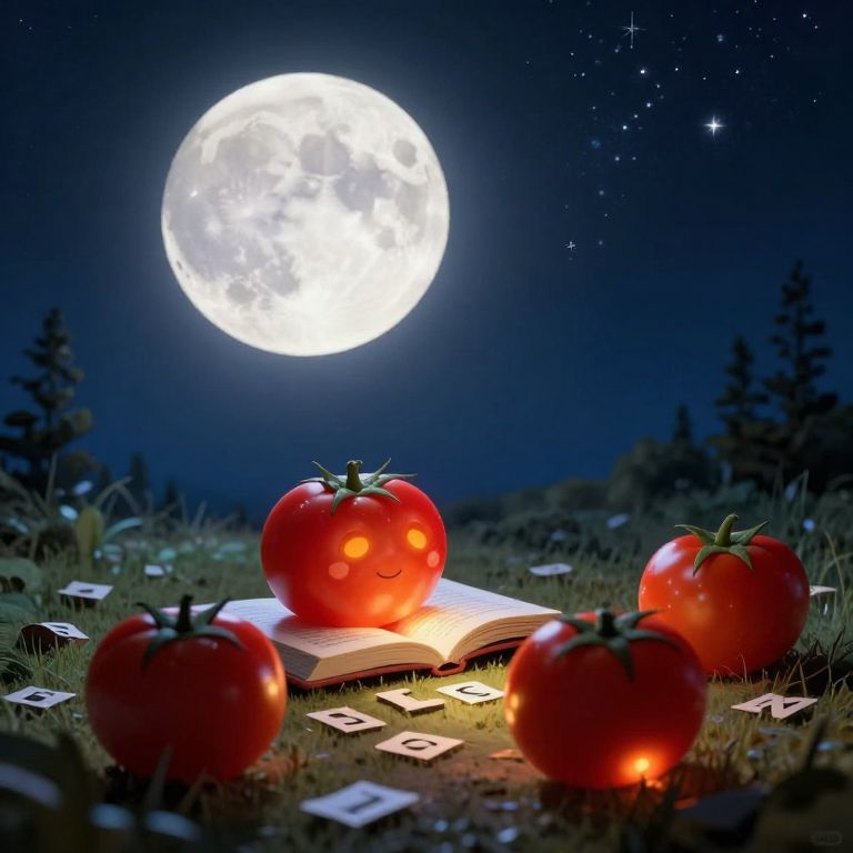 Glowing tomatoes gather under a luminous full moon, with one animated tomato sharing wisdom from an open book while surrounded by scattered letters, as three curious tomatoes listen intently in the starlit night.