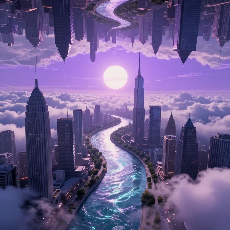 Under a radiant purple sun, towering skyscrapers pierce through swirling clouds, while a serpentine river of shimmering glass flows upward, mirroring an inverted cityscape suspended in the heavens.