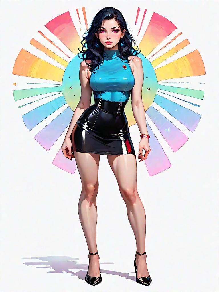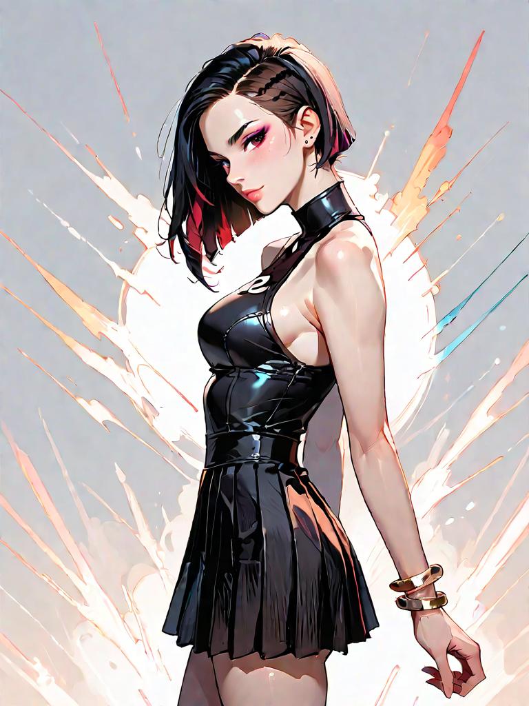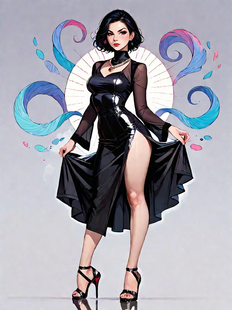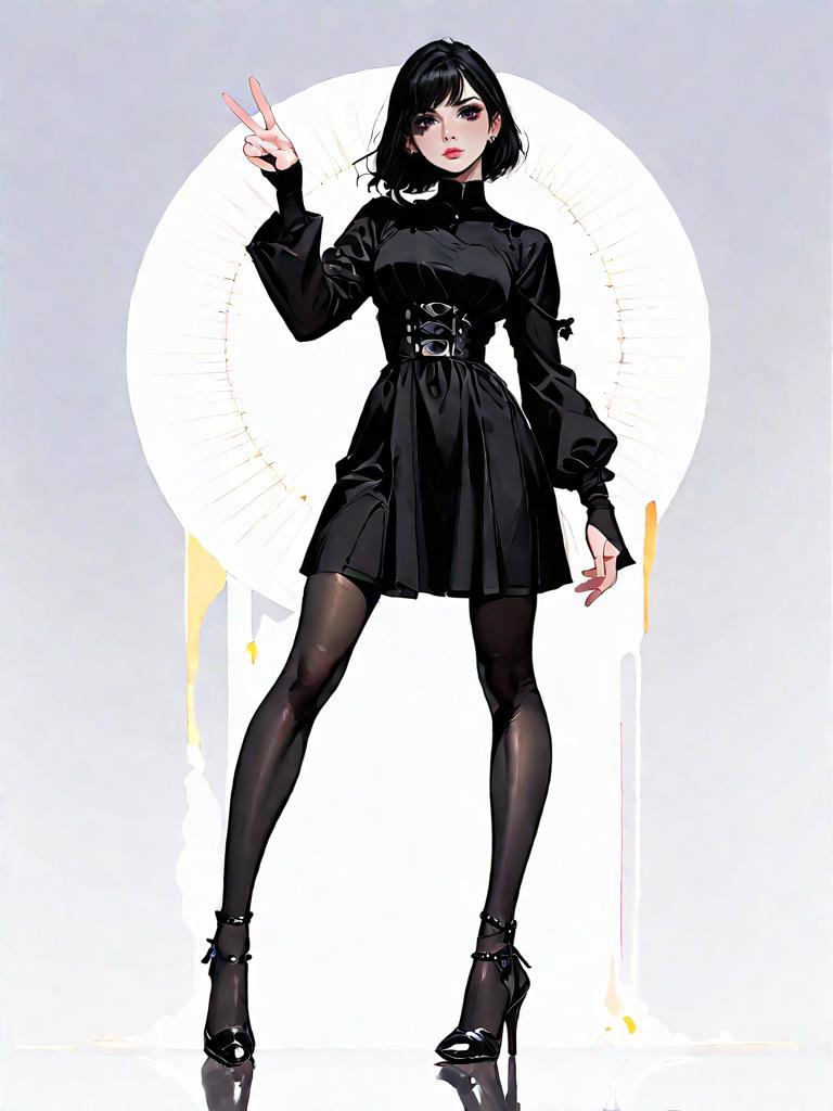 1girl, source_comics, realistic face, full body shot, Woman, casual, black mini dress, V-neckline, short cuffed sleeves, zipper at the front, slim belt with buckle, thigh-length, straight silhouette.