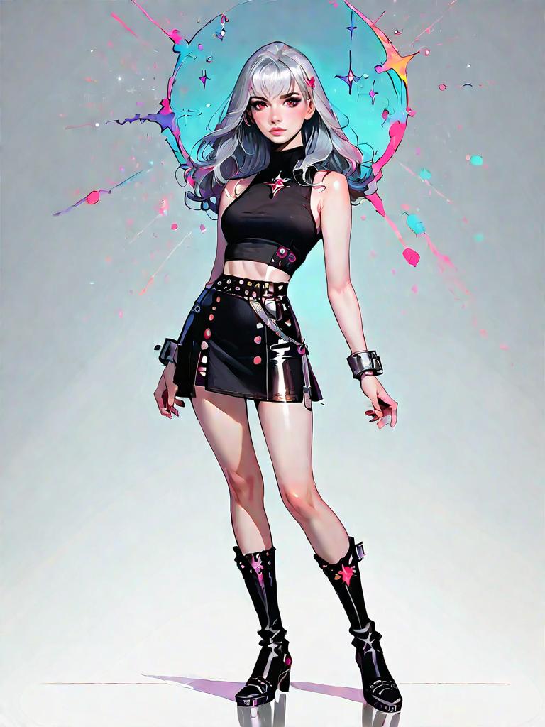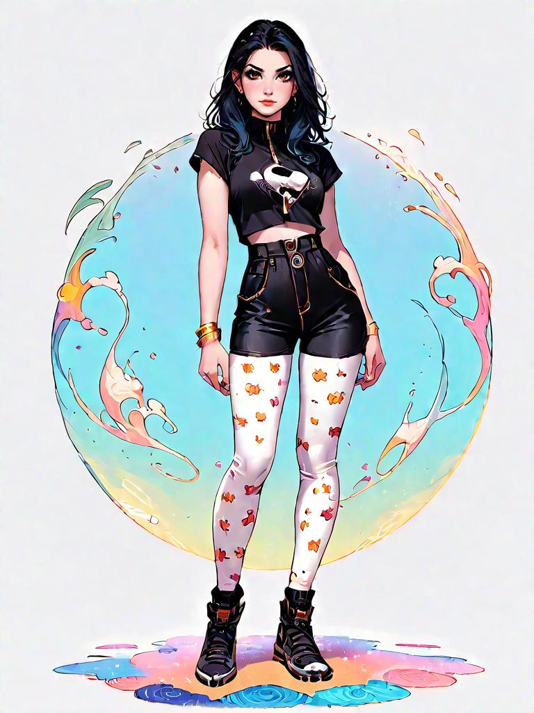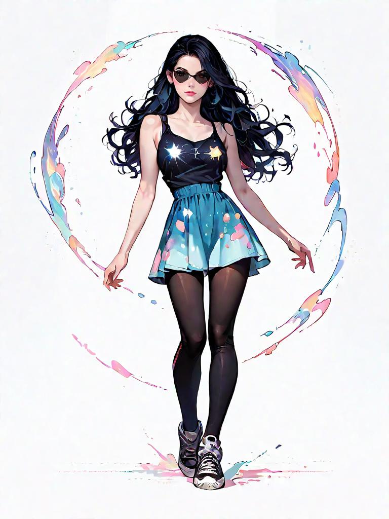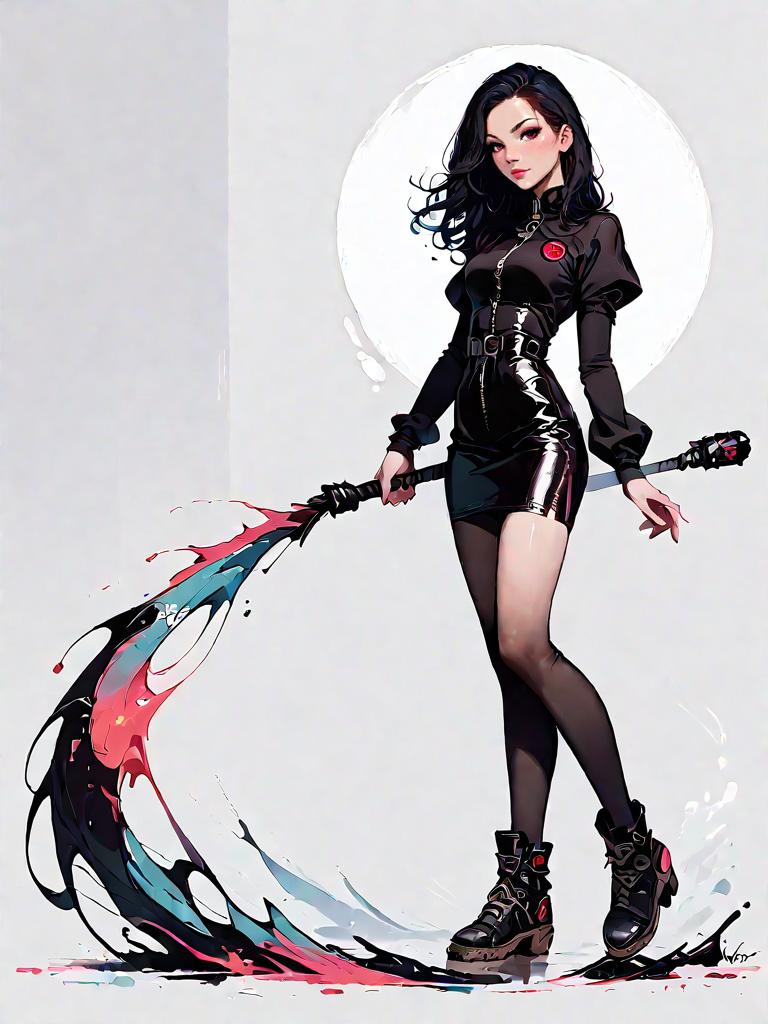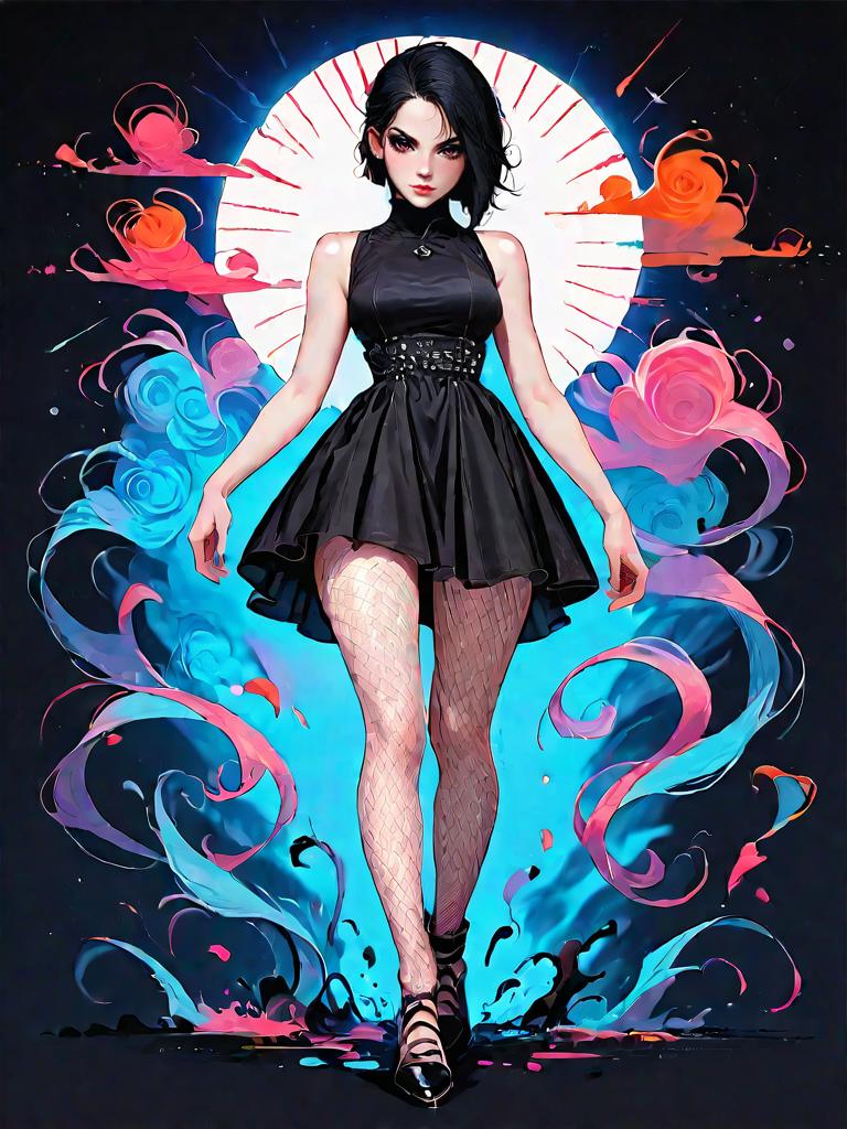 1girl, source_comics, realistic face, full body shot, Woman, casual, black mini dress, V-neckline, short cuffed sleeves, zipper at the front, slim belt with buckle, thigh-length, straight silhouette.
