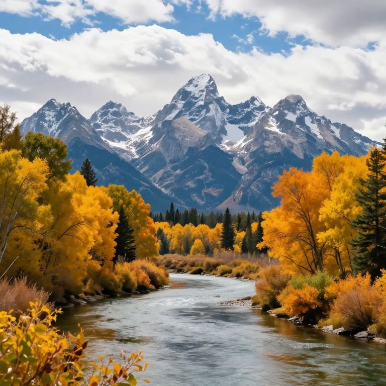Autumn's vibrant yellow and orange foliage frames a serene river winding through a lush valley, with majestic snow-capped peaks rising dramatically against a partly cloudy sky in the Tetons.
