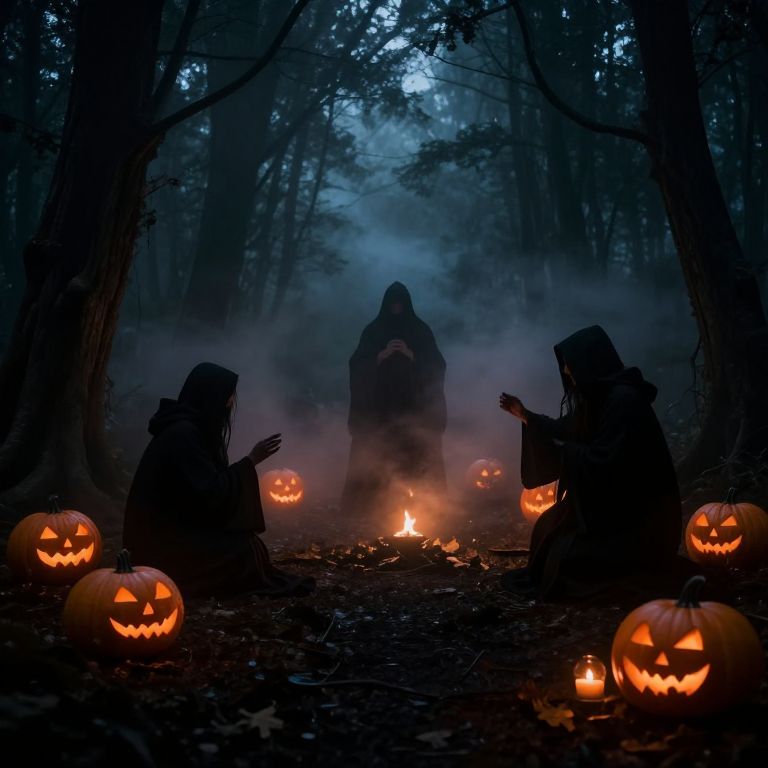 Photograph of a spooky Halloween scene in a dark, misty forest. Silhouetted against the blue twilight are three hooded, ghost-like figures sitting around a small campfire. They gesture with raised hands. Surrounding them are six carved jack-o'-lanterns with glowing, orange faces, placed on the forest floor. The dense trees, shrouded in mist, frame the scene, adding to the eerie atmosphere. The firelight casts a warm, flickering glow on the pumpkins and ghostly figures.