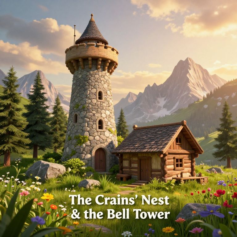 A picturesque 3D-rendered fantasy landscape featuring \"The Crains' Nest & the Bell Tower,\" with a rustic stone tower and wooden cabin nestled amidst lush greenery, vibrant wildflowers, and dramatic mountain peaks under a golden-hour sky, evoking a serene yet adventurous atmosphere.
