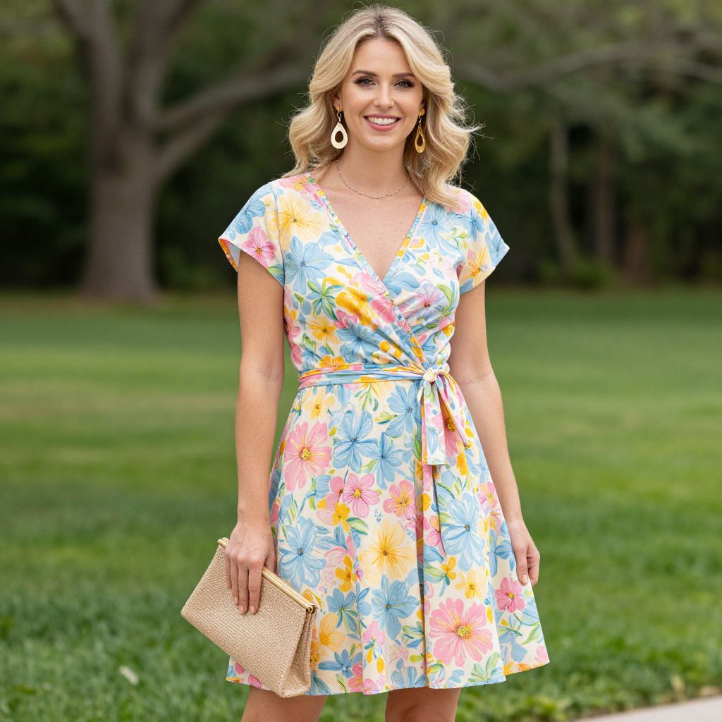 Photograph of a smiling blonde woman with wavy hair, wearing a short-sleeved, V-neck, floral dress with a wrap waist tie in pastel colors (yellow, blue, pink). She holds a beige, woven clutch in her right hand and wears large, white hoop earrings. She stands on a green lawn with trees in the blurred background. The dress's vibrant floral pattern contrasts with the greenery, and she exudes a cheerful, summer vibe. The image is bright and colorful, with the woman centered and making direct eye contact with the camera.