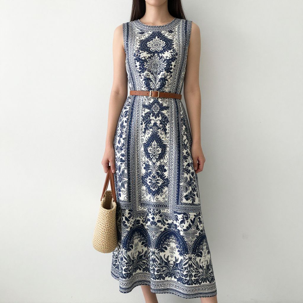Woman wearing a sleeveless, crew-neck maxi dress with intricate blue and white floral patterns, accessorized with a brown belt and holding a woven straw bag, standing against a plain white wall.