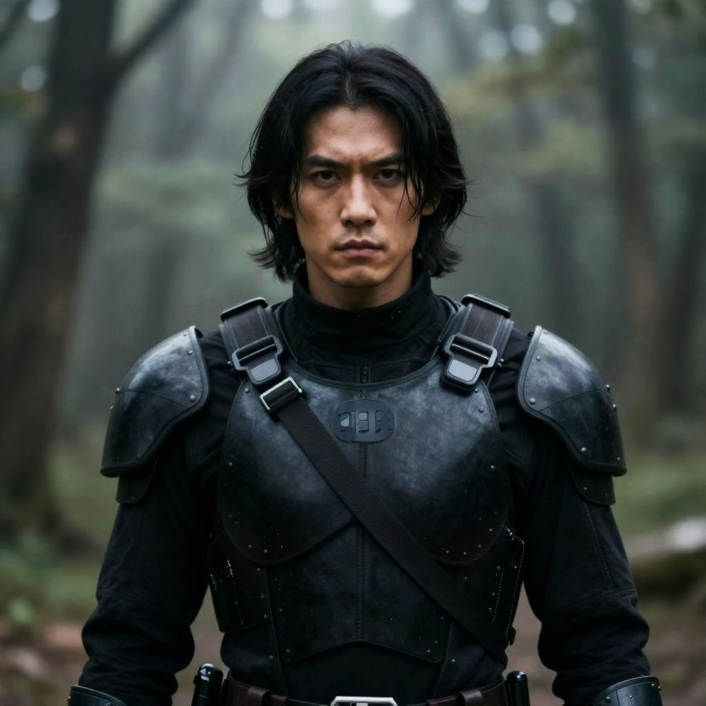Photograph of a man with medium-length black hair, dark stubble, intense gaze, wearing a dark, ured, armored cloak and holding a futuristic rifle. Background features blurred, dry, leafless trees. Man's right hand grips the rifle's handle, left hand partially visible.