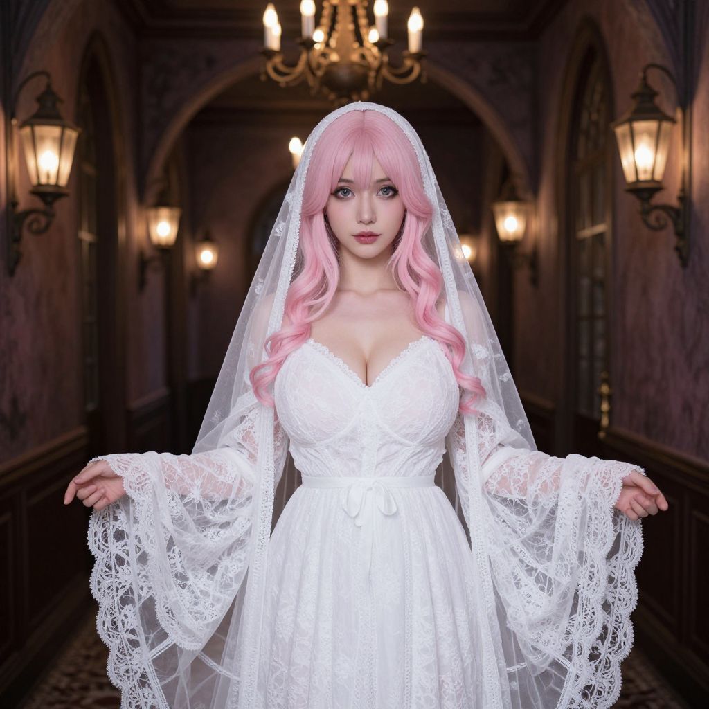 A graceful woman with soft pink skin and bright gray eyes dressed as a classic Halloween ghost in a flowing white lace dress with translucent veil, standing in a haunted mansion hallway adorned with old chandeliers and flickering lanterns. The woman has big breasts and cute face