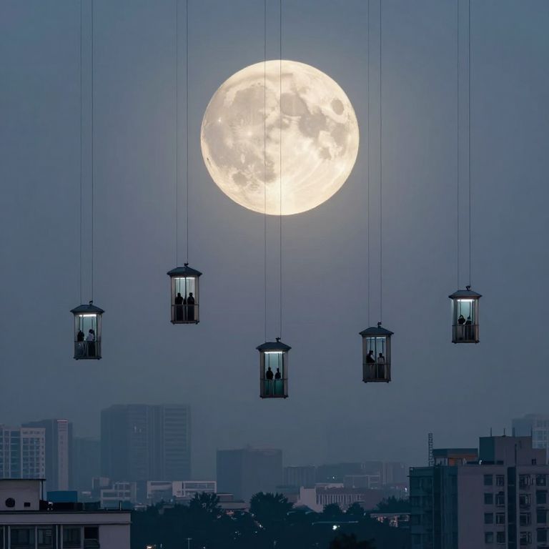 Crowded elevators dangle serenely from invisible threads against a misty urban backdrop, illuminated by the ethereal glow of a massive moon and its celestial companion, creating a surreal dreamscape where gravity defies convention.