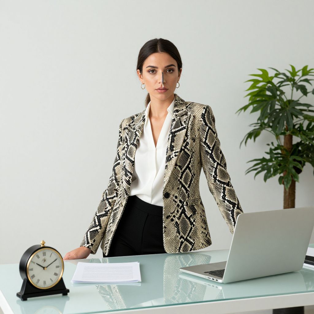 A stylish office interior scene featuring a woman with a sharp nose and confident posture, wearing a snakeskin pattern blazer over a white blouse, sitting at a sleek desk with a laptop, vintage clock, and a potted plant in the corner.
