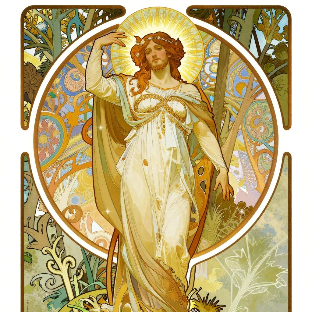 Jesus in the garden of Gethsemane, depicted as Mary Magdalene in a transcendent spiritual moment. Rendered in art nouveau style with art by Alphonse Mucha. Focus on ornate natural forms, flowing robes, radiant decorative halo and radiant filtered daylight.