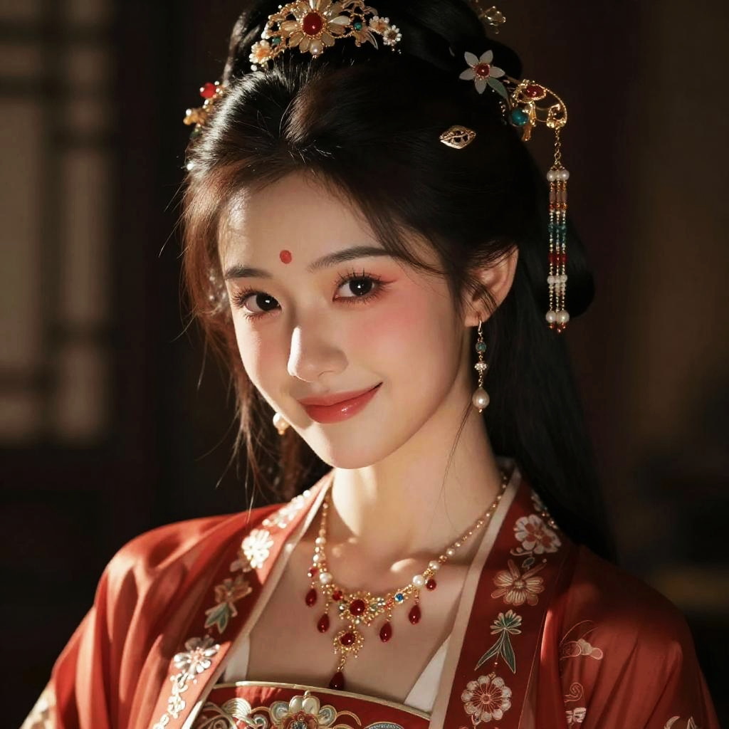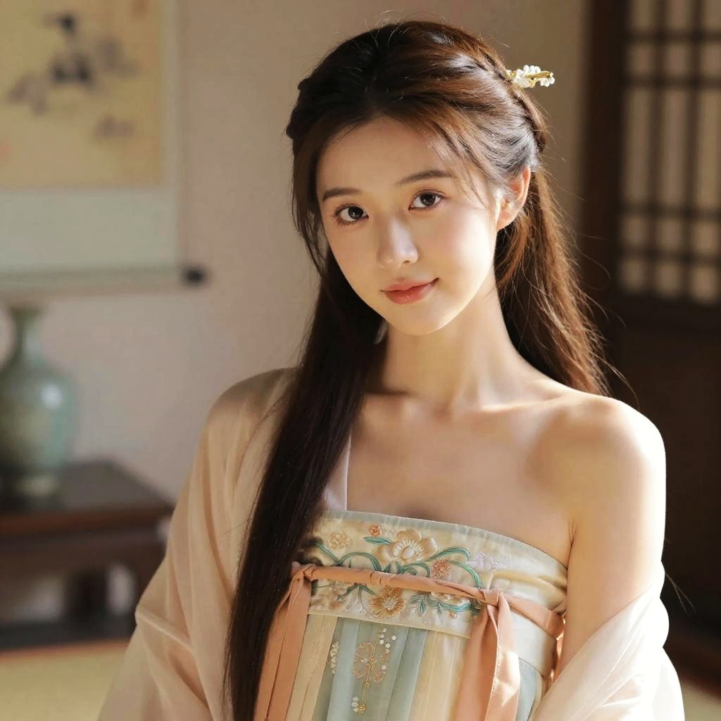 (masterpiece), (RAW photo, best quality), (realistic, photo-realistic:1.3), (ultra-high res), (ultra-detailed), (best shadow), 1girl at home, (hanfu, dress), bare shoulders, collarbone, (long brown hair:1.2), looking at viewer, light smile, upper body, makeup