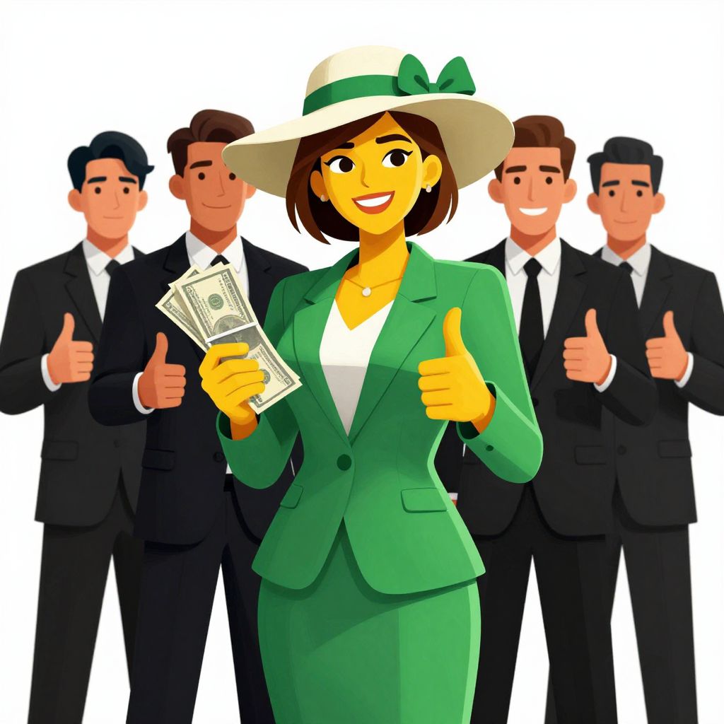 Digital illustration of a confident woman in a green business suit and wide-brimmed hat, holding money and pointing forward. She has short brown hair, yellow skin, and a bright smile. Behind her are four men in black suits and ties, giving thumbs-up gestures. The background is white with a bold, graphic style. The woman's hat has a decorative green ribbon.