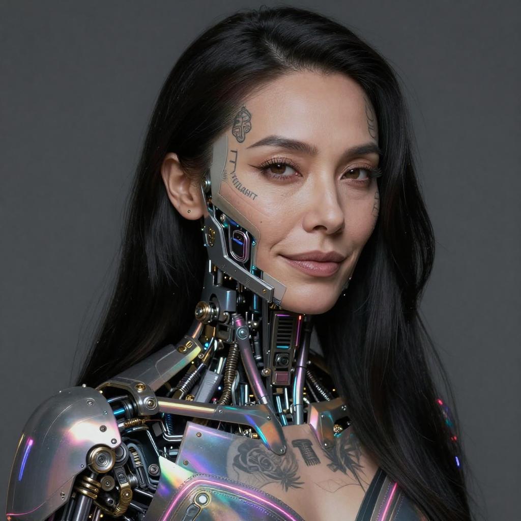 Detailed portrait cyberpunk (sks woman) (40 year old sks woman), futuristic neon reflective wear, sci-fi, robot parts, ismail inceoglu dragan bibin hans thoma greg rutkowski alexandros pyromallis nekro rene margitte illustrated, perfect face, ((tattoo)), (long hair), matte skin, pores, wrinkles, hyperdetailed, hyperrealistic, Moody Lighting, Hasselblad Award Winner, Soft Diffuse Lighting, Smirk, machine face, fine details, realistic shaded, intricate, elegant