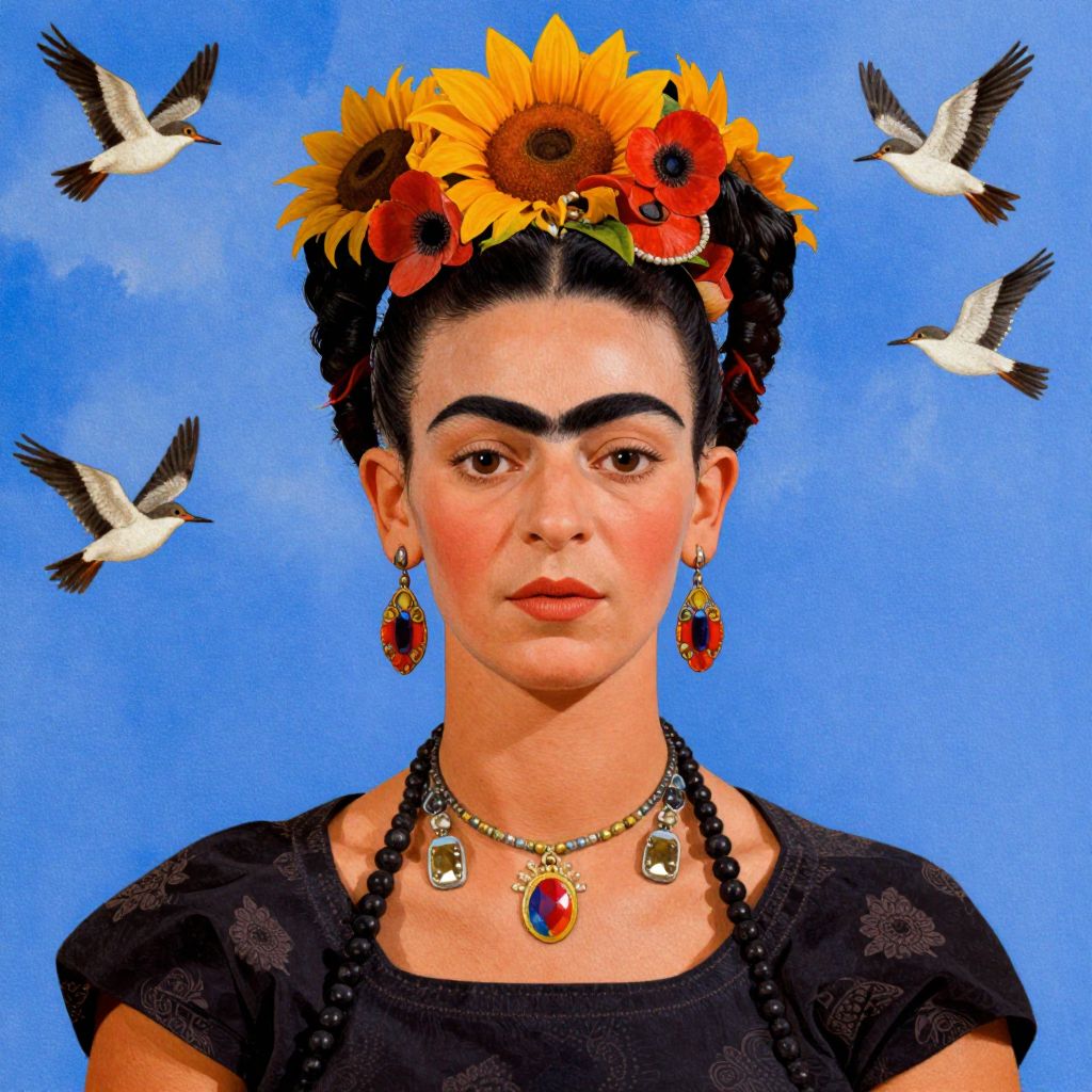 A vibrant digital illustration inspired by Frida Kahlo's self-portrait style, featuring a woman adorned with a sunflower halo, red poppies, and intricate jewelry, set against a vivid blue sky with flying birds, rendered in a high-definition, painterly aesthetic.