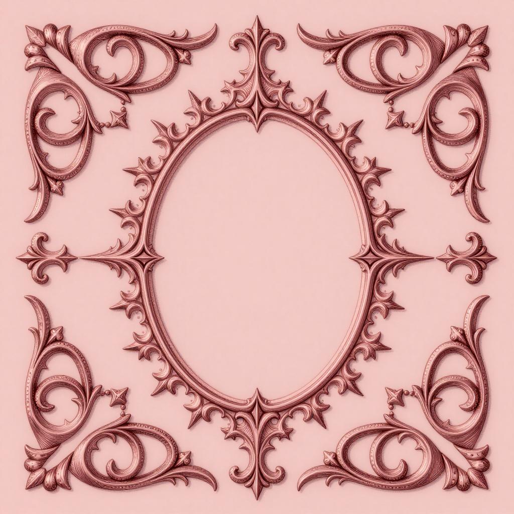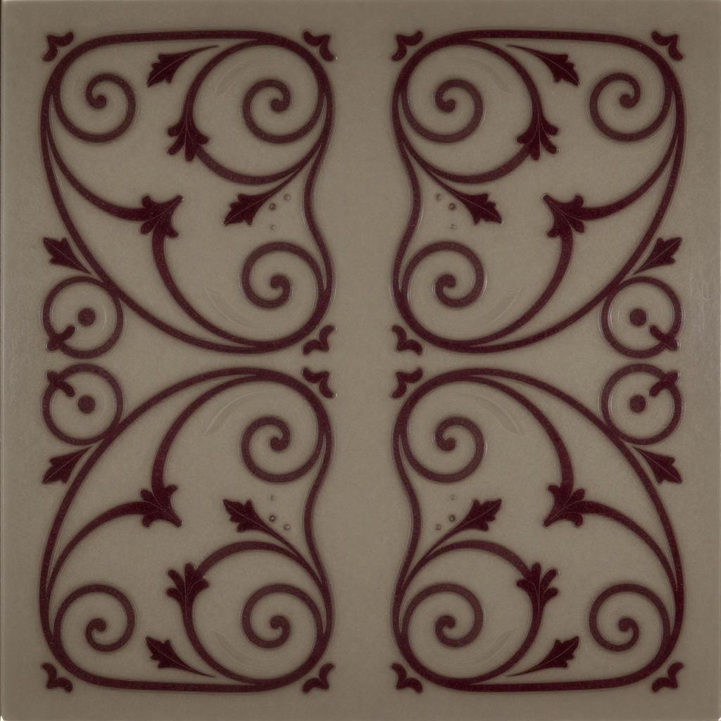 Scrollworks pattern featuring Art Nouveau flowing organic tendrils with stylized leaves in deep burgundy scrollwork on muted taupe arranged as symmetrical mirror-image scrolls left and right of center on glass panel with frosted scroll etching rendered as laser-etched effect with glowing edges, ultra-detailed, sharp ornamental design, high resolution, intricate decorative pattern art
