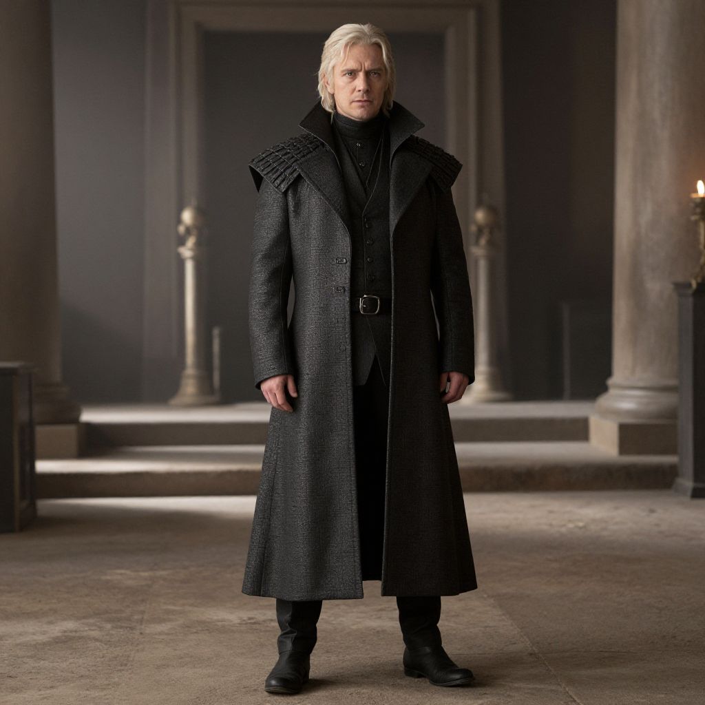Photograph of a stern, middle-aged man with platinum blonde hair standing in a dimly lit, grand hall. He wears a long, black, textured overcoat with a high collar, black shirt, and black boots. The background features tall, stone columns and a shadowy, ornate doorway. The overall atmosphere is dark and somber, with muted colors and soft lighting highlighting the man's intense expression and imposing presence. The setting resembles an old, Gothic-style building.
