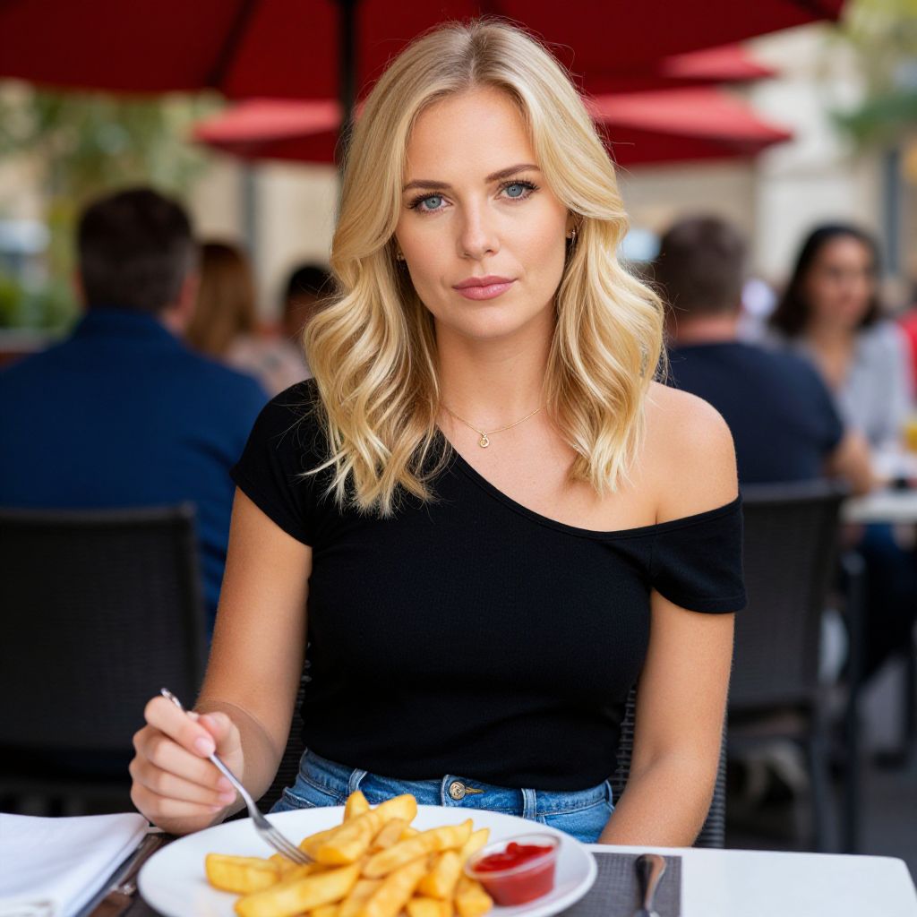 Photograph of a blonde woman with wavy hair and blue eyes, sitting at an outdoor restaurant. She's wearing a black off-shoulder top and blue jeans, holding a fork over a plate of fries with a small cup of ketchup. The background is blurred, showing other diners and red umbrellas. She has a neutral expression and is centered in the frame.