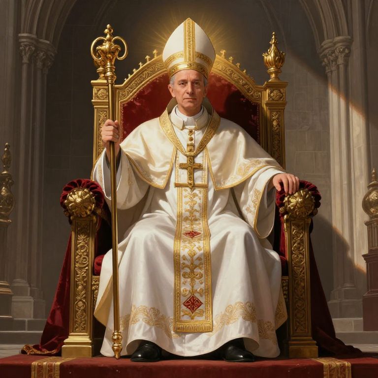 Pope sitting on throne surrounded by ancient gothic architecture, rich velvet cushions, intricate embroidery on robes, golden halo effect, ceremonial bishop's staff in hand, dramatic lighting with shadows, peaceful yet powerful expression, digital art