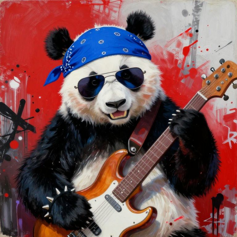 Digital art of a panda wearing sunglasses and a blue bandana, playing an electric guitar against a red and black abstract background.