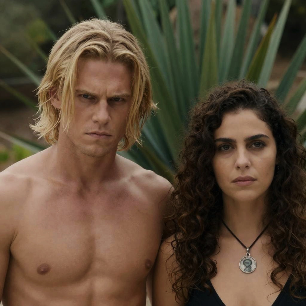 Photograph of three people standing together against a clear blue sky. A muscular white man with short brown hair in a red sleeveless shirt, a smiling woman with dark hair in a white floral blouse, and a smiling shirtless Black man with a red turban and brown loincloth. The man on the left has his arm around the woman. The man on the right has a sheathed dagger on his waist. All three are smiling.