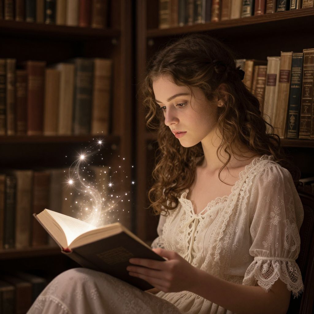 Enchanted wisps of light and sparkles swirl above an open book as a young woman, dressed in a delicate lace-trimmed dress, reads intently in a dimly lit library filled with shelves of ancient tomes.