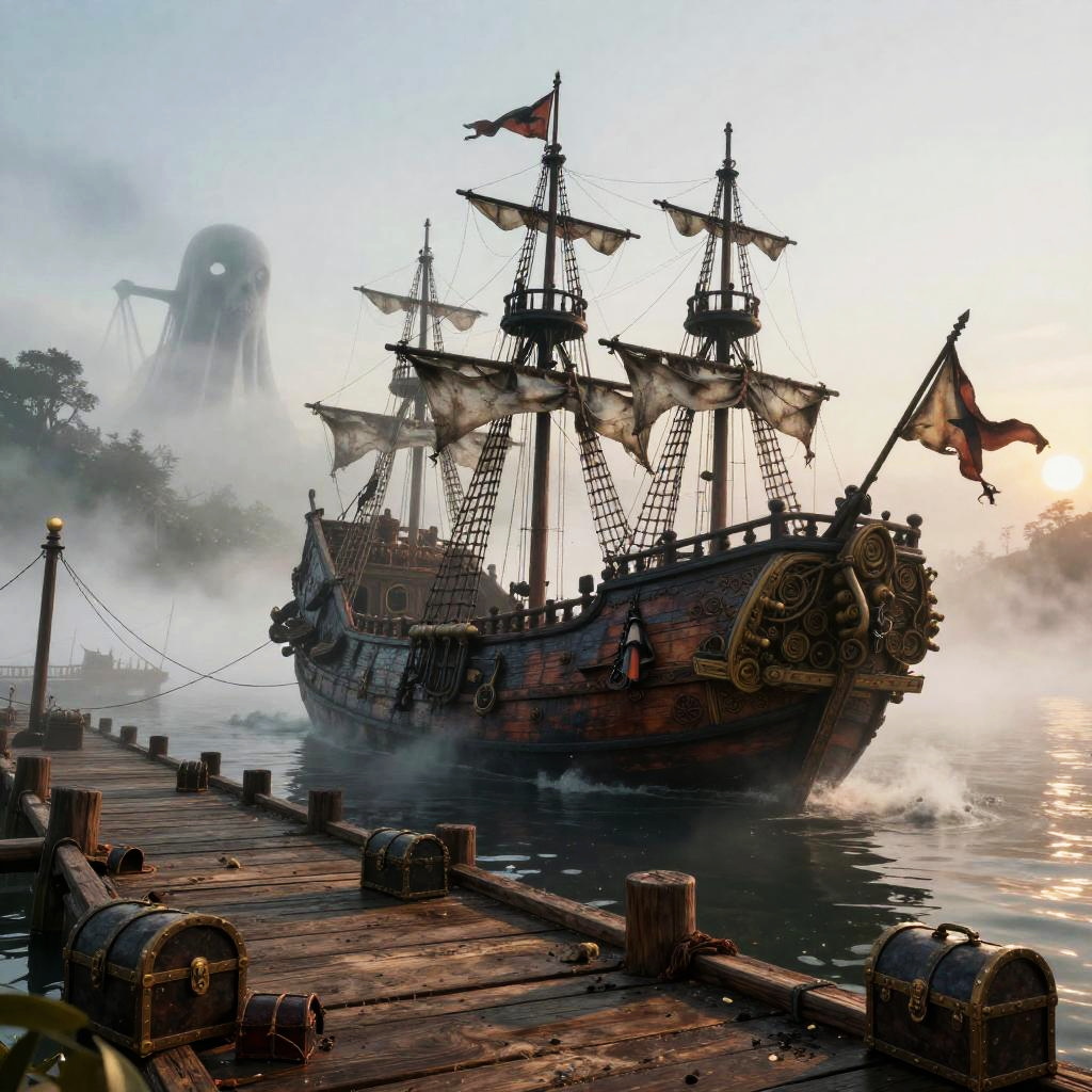 One Piece generator futuristic machinery, colossal pirate-themed energy generator with rotating sails and steam vents, set on a rugged island cliff under stormy skies, rich in details, combining steampunk and fantasy aesthetics.