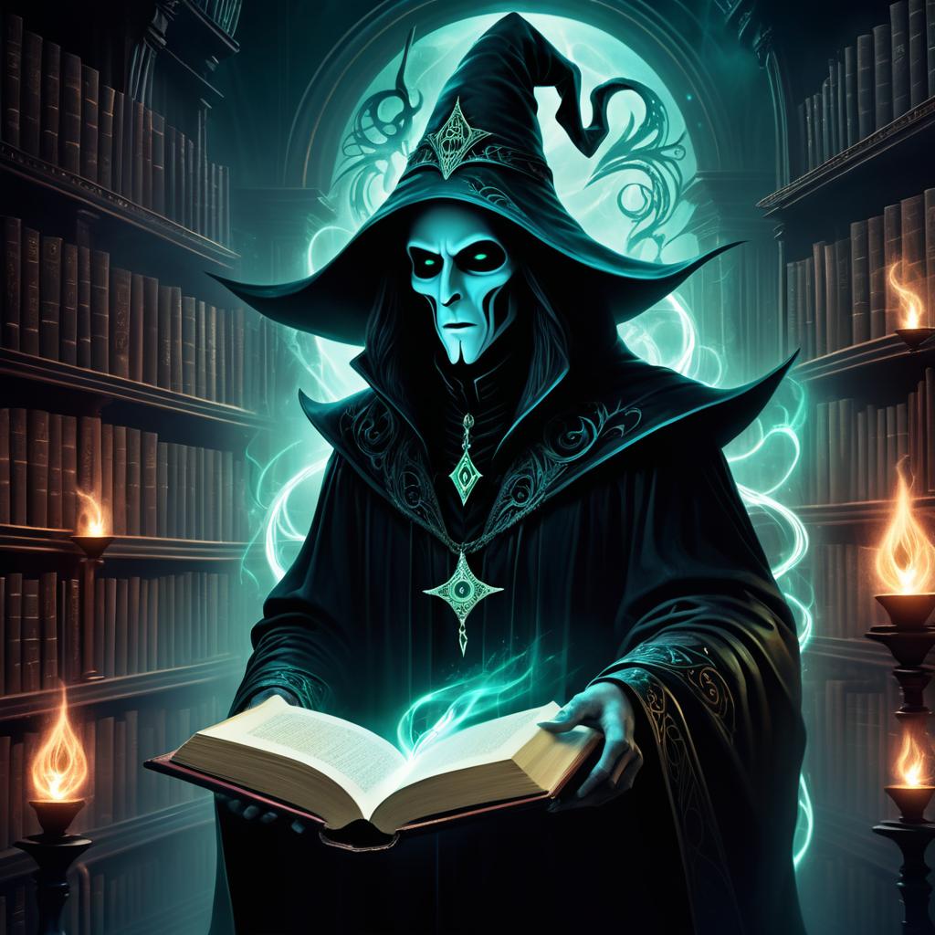 Dark fantasy depiction of cursed warlock illustrated in surrealist style within a spectral library