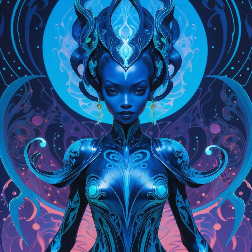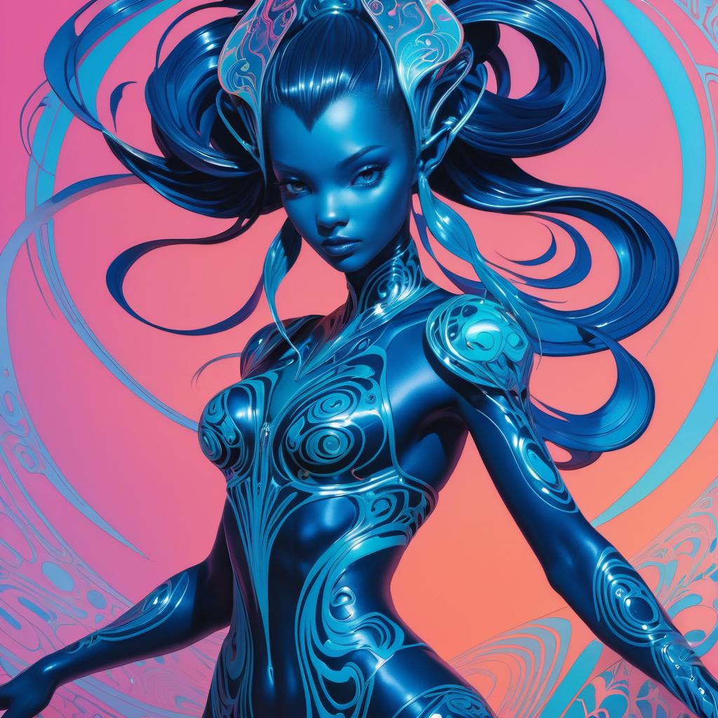 A sleek alien woman with bioluminescent skin and intricate patterns, colorful and cinematic style by Claire Wendling, James Jean, Lisa Frank.