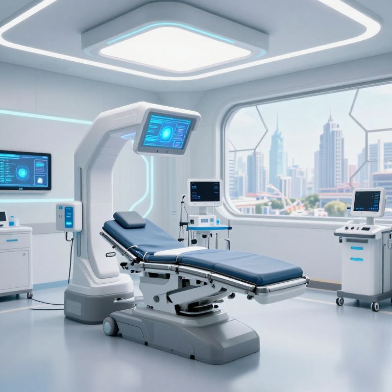 The image depicts a futuristic emergency room, characterized by advanced, automated, and high-tech features. The room exudes a sterile and modern design, with digital displays and smart systems integrated seamlessly into the environment. The solarpunk aesthetic is evident through the efficient processes and advanced medical equipment, which include a sleek, ergonomic bed and various monitoring devices. The room is bathed in bright, ambient lighting, creating a clean and technologically advanced appearance. The overall composition is minimalistic, with clean lines and a focus on functionality. Large honeycomb windows provide a view of a solarpunk city, adding depth to the scene. The room's layout is efficient, with objects arranged in a way that promotes easy access and optimal workflow.