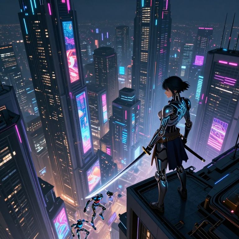 A digital artwork depicting a futuristic cityscape from an aerial perspective, skillfully merging photorealism with anime-inspired elements. Towering skyscrapers, their facades adorned with vibrant neon lights, dominate the skyline. Within the labyrinth of narrow alleys beneath, agile androids weave through the space, dodging holographic advertisements that shimmer and pulse in the night air like fireflies. A lone figure, a female warrior resplendent in glowing circuits and robotic armor, stands atop a building's edge, her gaze fixed on the sprawling metropolis below. Her expression is a fusion of determination and introspection as she holds her katana, its blade reflecting the city's kaleidoscopic glow. The juxtaposition of advanced technology with traditional warrior ethos, combined with the interplay between action and reflection, crafts an immersive scene brimming with intricate details and profound emotional resonance.
