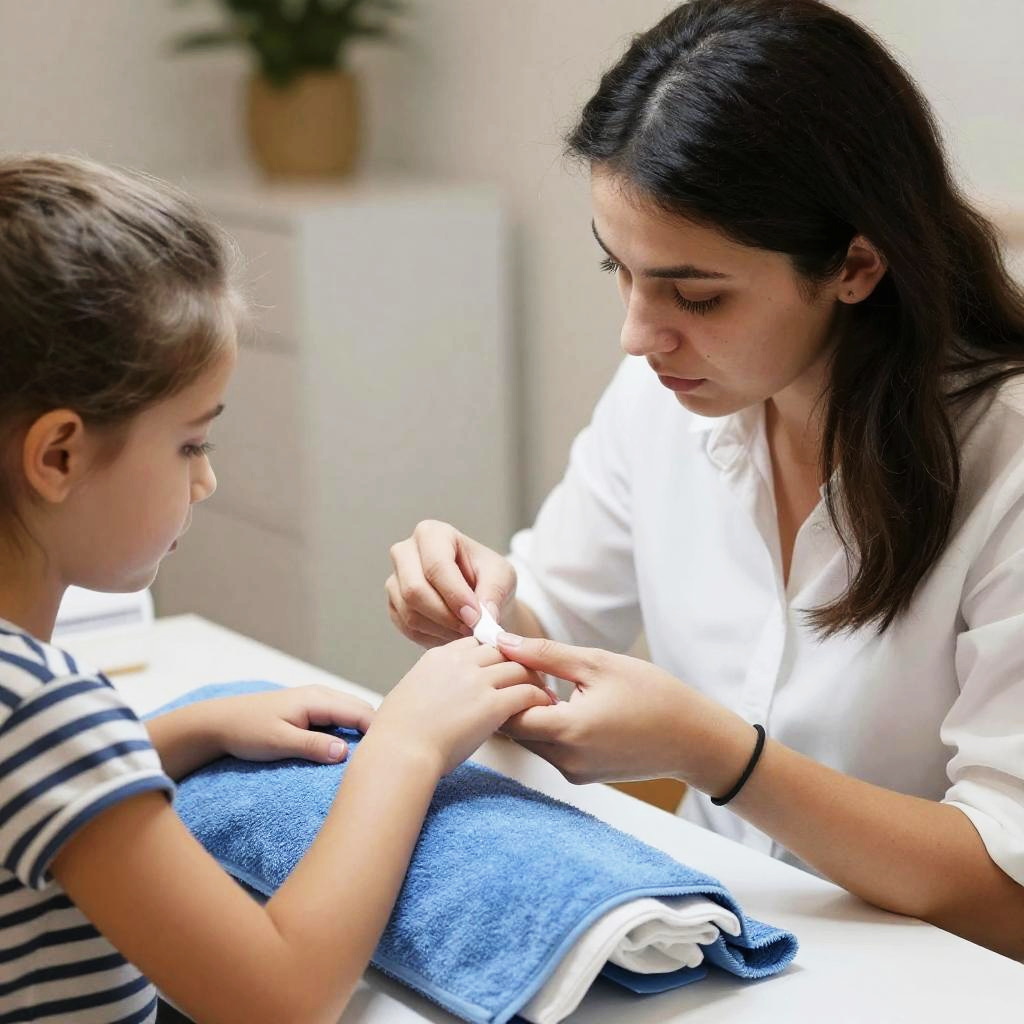 A photo of a nail salon scene where a young girl with brown hair, wearing a striped shirt, sits at a table. A nail technician, with long dark hair and a white shirt, is carefully wrapping the girl's fingers with white cotton. The girl's hands rest on a blue and white towel, and the technician wears a black wristband. The background is blurred.