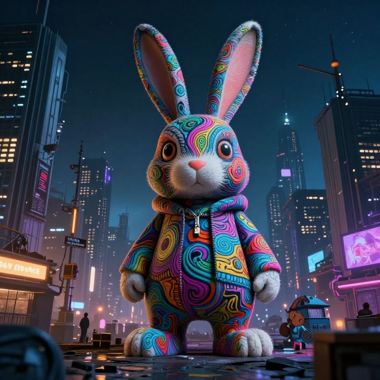 Belle using paranoia critical method create a giant psychedelic graffiti skeleton rabbit come to life in a dystopian future cityscape at night, hidden images, photorealistic, unreal engine,