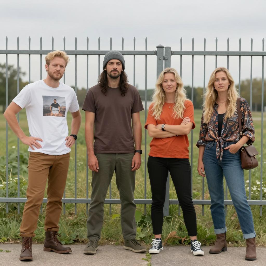 Four people sitting outdoors at a round table: a bearded man with long blonde hair wearing a dark sleeveless vest and armband, two young women with curly brown hair and red vests, and a bearded man in a black hat and white shirt playing an acoustic guitar. The setting includes a chain-link fence and a grassy field in the background with other blurred people.