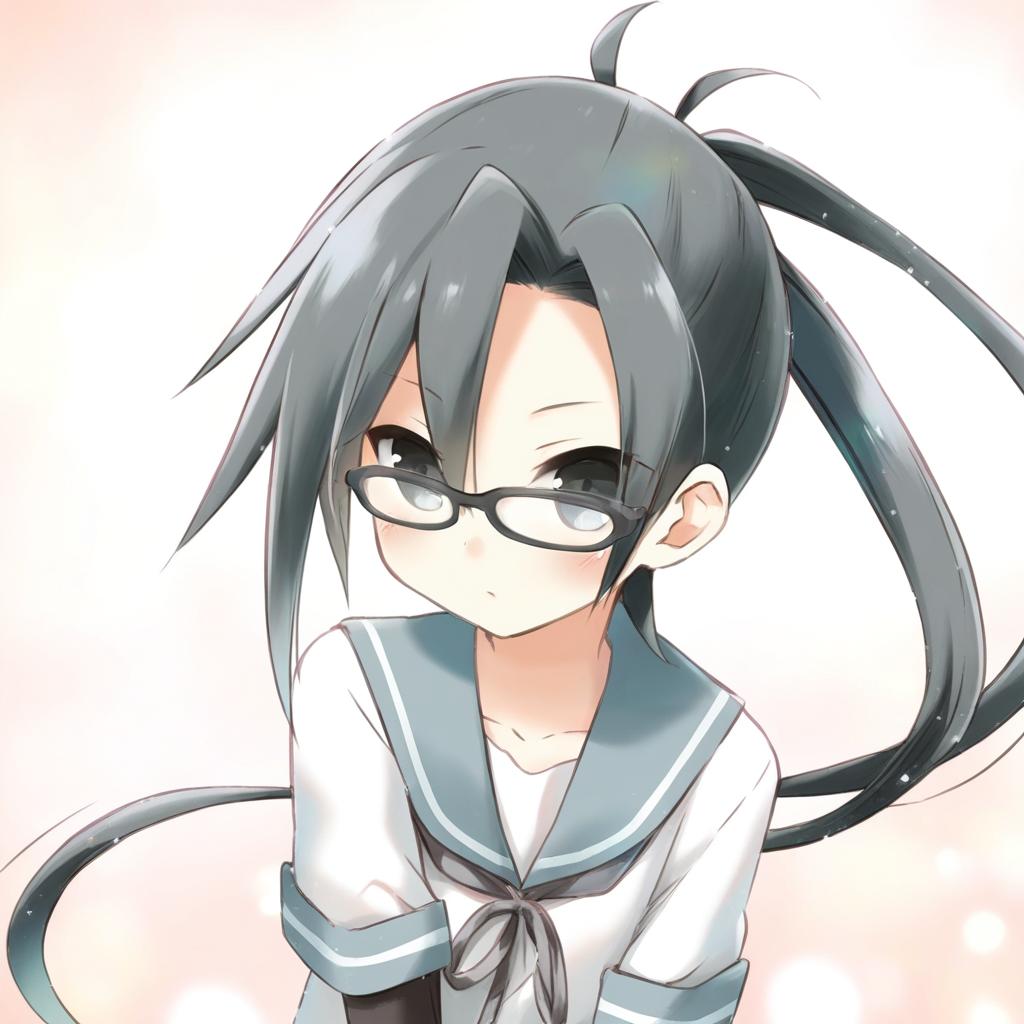 Amagiri (kancolle), kantai collection, 1girl, grey eyes, hair between eyes, glasses, grey hair, very long hair, black hair, ponytail, asymmetrical bangs, serafuku, by artist eretto, leet