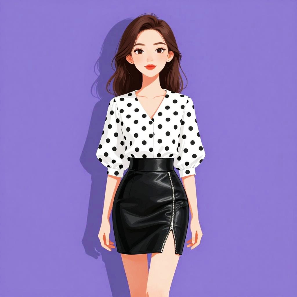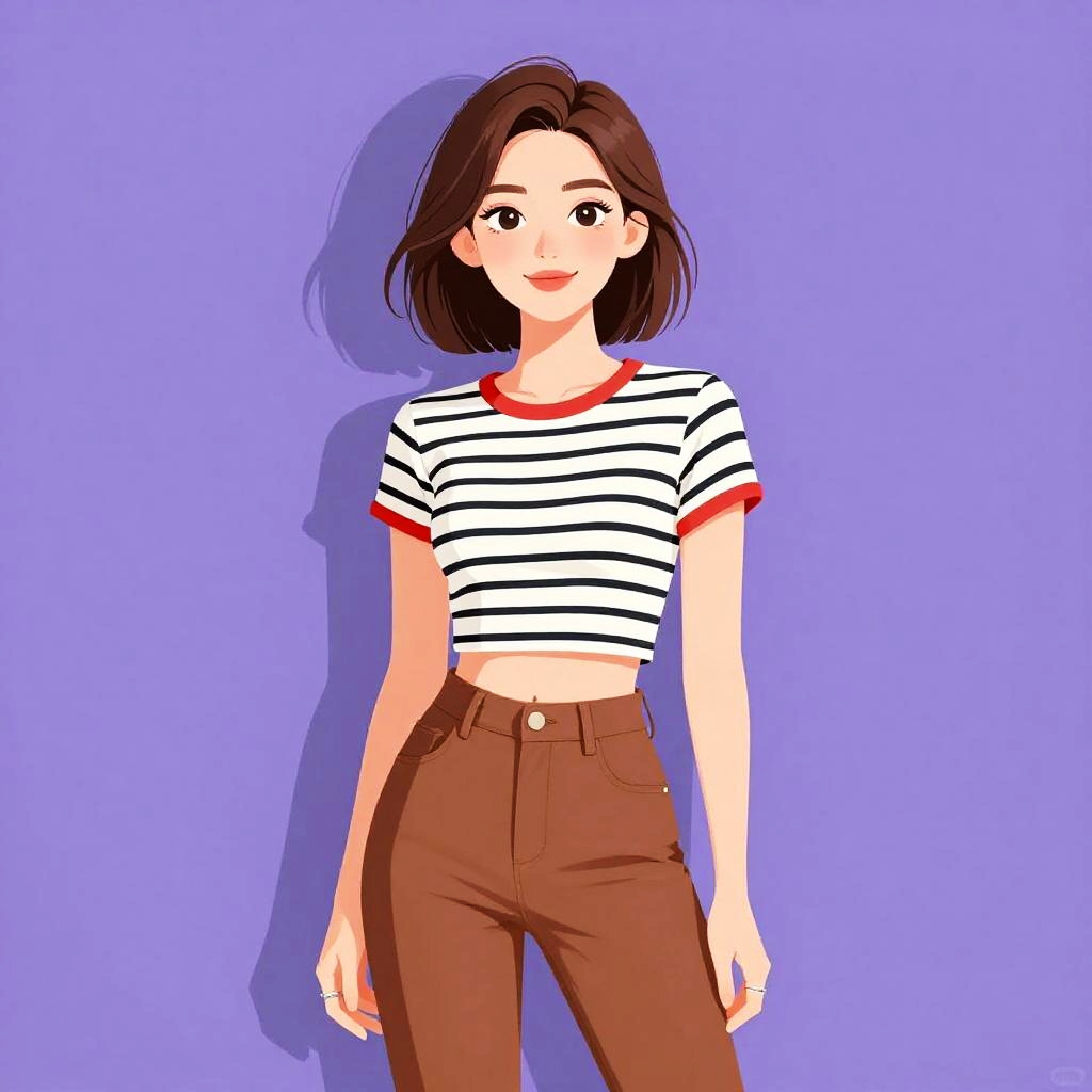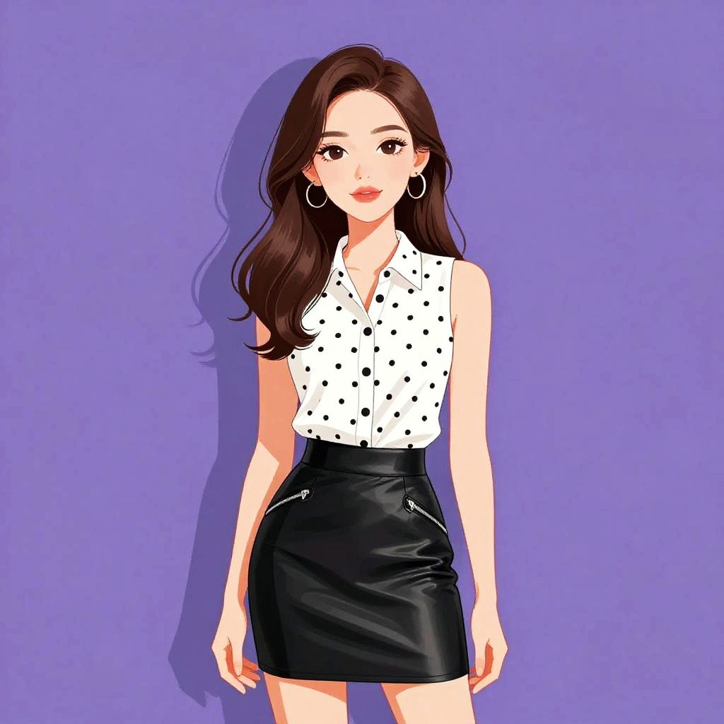 Illustration of a stylish woman with a pretty face and long brown hair, wearing a beige lace crop top with short sleeves and a sheer neckline paired with a navy blue knee-length pencil skirt. She has minimal accessories including large hoop earrings, standing against a solid purple background.