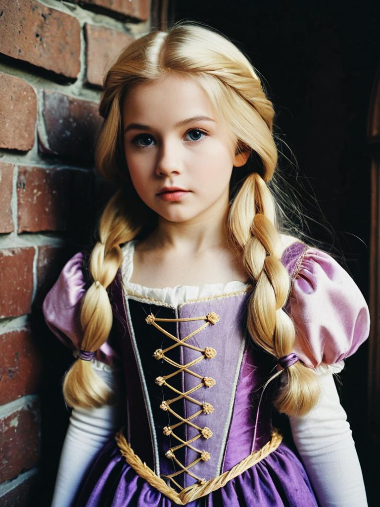 Child in Rapunzel Costume, waist-up editorial portrait, photorealistic tones