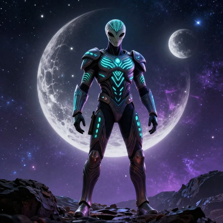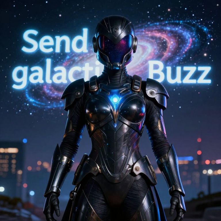 Female, superhero, fully dressed, goddess, doing shores, night, cosmic, galactic, extremely detailed overall, closer, upper body, portrait, mega armor, black piano color amor, faceless helmet, portal, galactic nova, night city, far back outdoor with glowing letters that form the following phrase written 'Send galactic Buzz' with letter out of height
