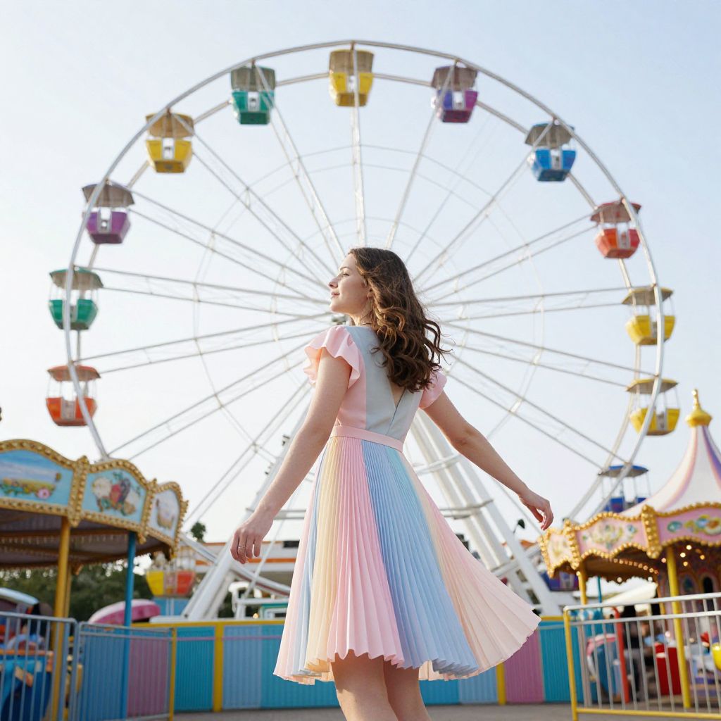 Amidst the vibrant hues of a summer amusement park, a woman in a pastel pleated dress embodies a delicate balance of serenity and playful freedom, her silhouette framed by the Ferris wheel's endless cycle of ascent and descent, evoking a sense of timeless joy and the ephemeral beauty of the present moment.