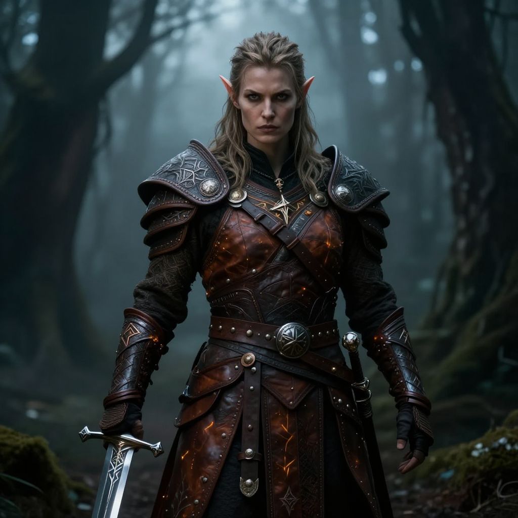 A detailed digital illustration of a blonde, fair-skinned, blue-eyed woman in medieval warrior attire. She wears a silver chest plate, green knee-length skirt over a white shirt, brown leather boots, and a brown backpack. She holds a sword on her back and has a stern expression. Surrounding her are various sketch-style drawings of her in different poses, along with detailed images of her armor, shield, and three different types of swords. The background is white, emphasizing the character and her equipment. The style blends realistic digital painting with sketch-like line art.