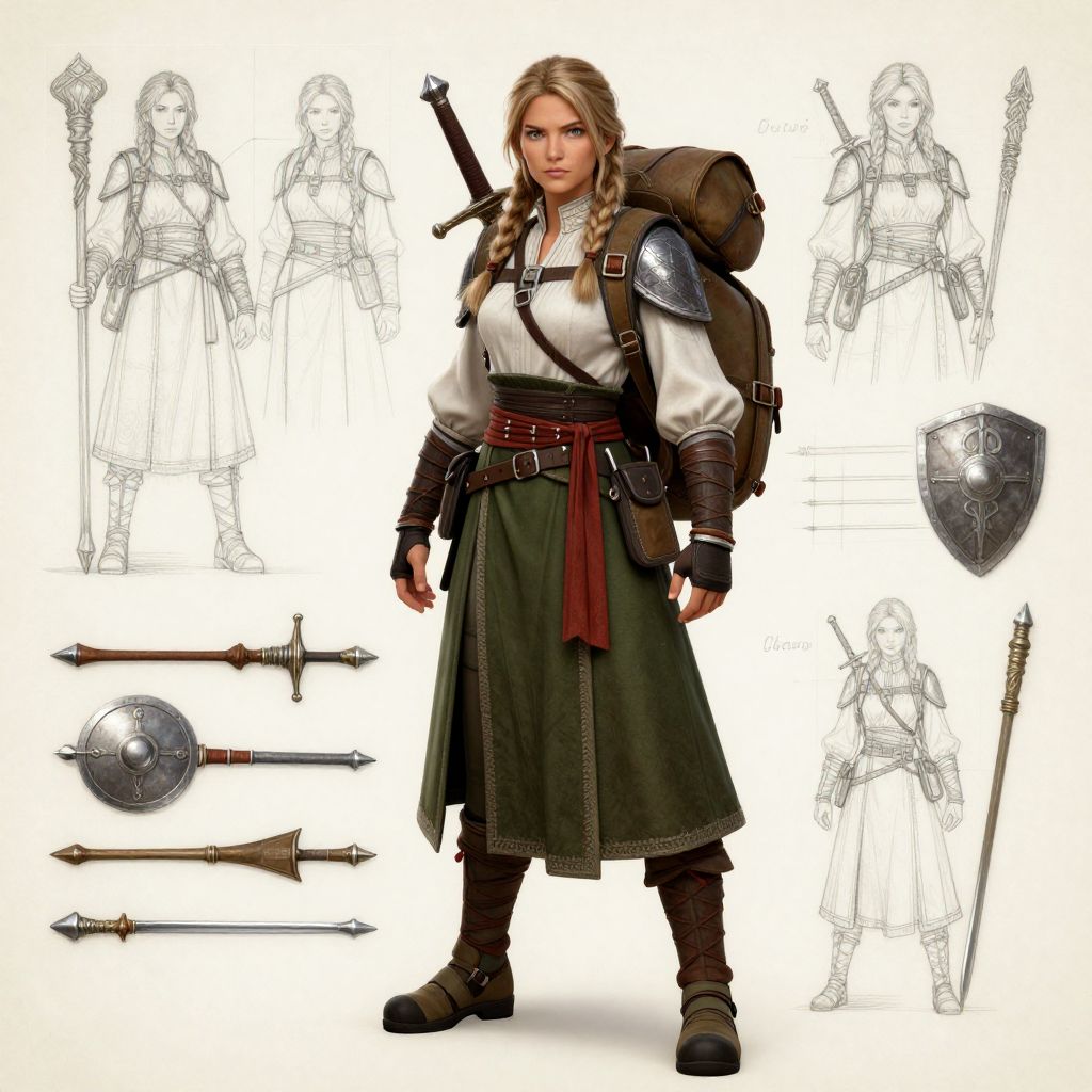 The image is a detailed character layout design sheet for a strong medieval woman adventurer. The character is depicted in various poses, showcasing her attire and equipment. She wears a white taktop with puffed sleeves, a green skirt, and a red sash around her waist. Her outfit is complemented by a large, brown backpack adorned with straps and buckles, and a smaller side bag. She carries a sword on her back, and her feet are clad in sturdy climbing shoes. The character's hair is styled in two braids, one on each side, and she has a determined expression on her face. The background includes sketches of other characters and objects, such as a staff, a shield, and various weapons, arranged in a grid-like pattern. The overall composition is well-balanced, with the character centrally positioned and the background elements providing context and depth to the design sheet.