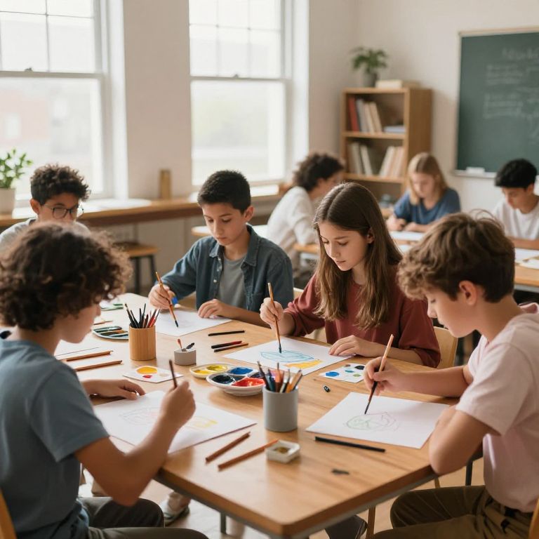 A group of preteens in a cozy modern classroom, engaged in a creative art project with paints and brushes, natural light streaming through large windows, showcasing diversity and collaboration in a warm, inviting atmosphere