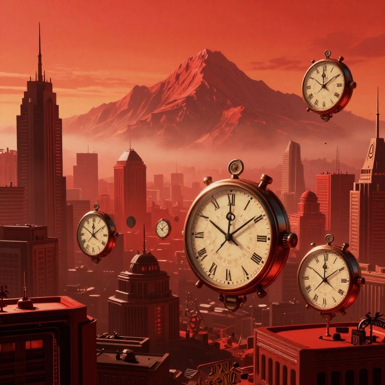 Photograph-style digital art: Giant, floating clock faces hover above a red-hued cityscape with towering skyscrapers and a distant mountain, creating
