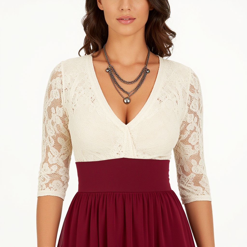 "Woman, girly, ivory lace top with three-quarter sleeves, deep V-neckline, contrasted with a maroon pleated chiffon skirt, empire waist, adorned with a metallic layered necklace, mini-length.. Sexy. Pretty face and beаutiful eyes. Big breasts."