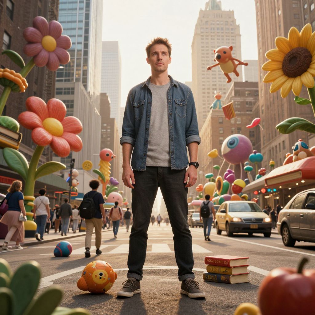 Vibrant urban landscape: A man stands tall amidst the hustle and bustle of a busy city street, surrounded by an array of surreal elements, including giant flowers, floating books, whimsical creatures, and unexpected objects, all bathed in warm, golden daylight that illuminates their peculiar forms. The scene is filled with energy, curiosity, and Man has masculine face and piercing eyes